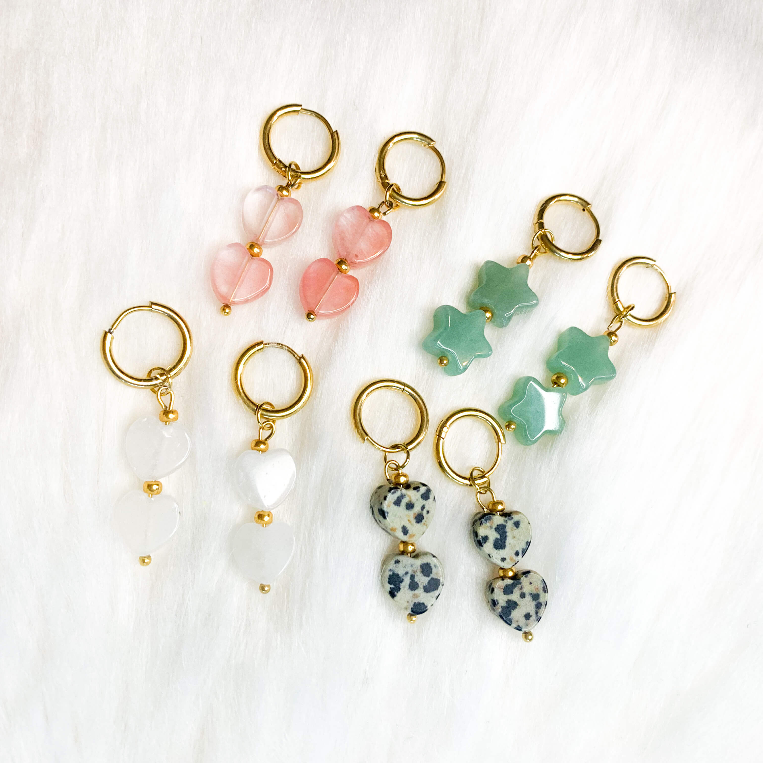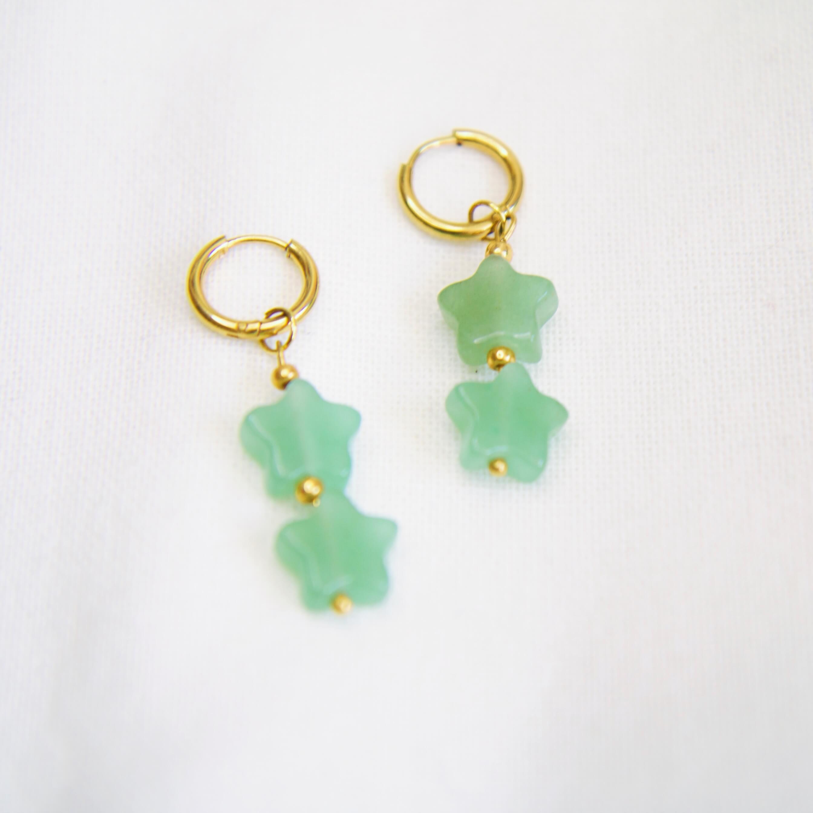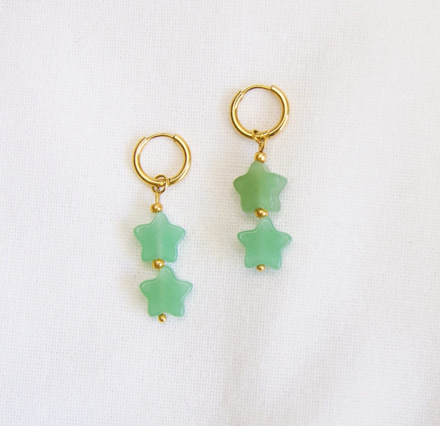 Deze unieke oorbellen zijn gemaakt van stainless steel ringen met daaraan een sterren kralen echt natuursteen,  de Aventurijn (kwarts)! Tussenin bevinden zich kleine gouden Miyuki kraaltjes.