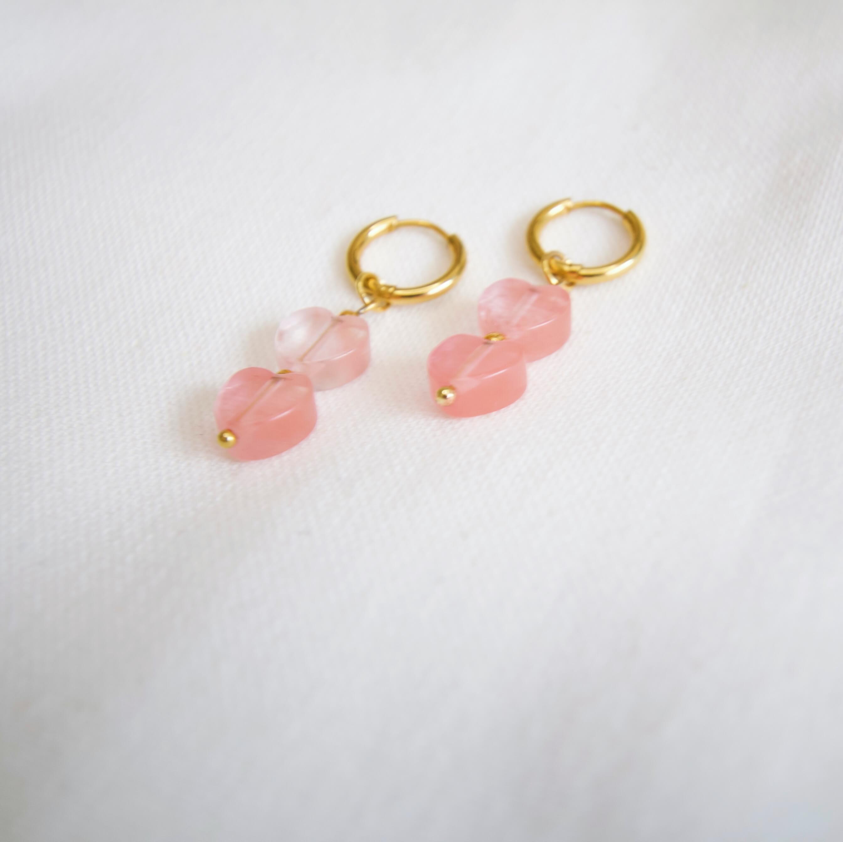 Deze unieke oorbellen zijn gemaakt van stainless steel ringen met daaraan een hartjes kralen van imitatie natuursteen glas! Tussenin bevinden zich kleine gouden Miyuki kraaltjes.