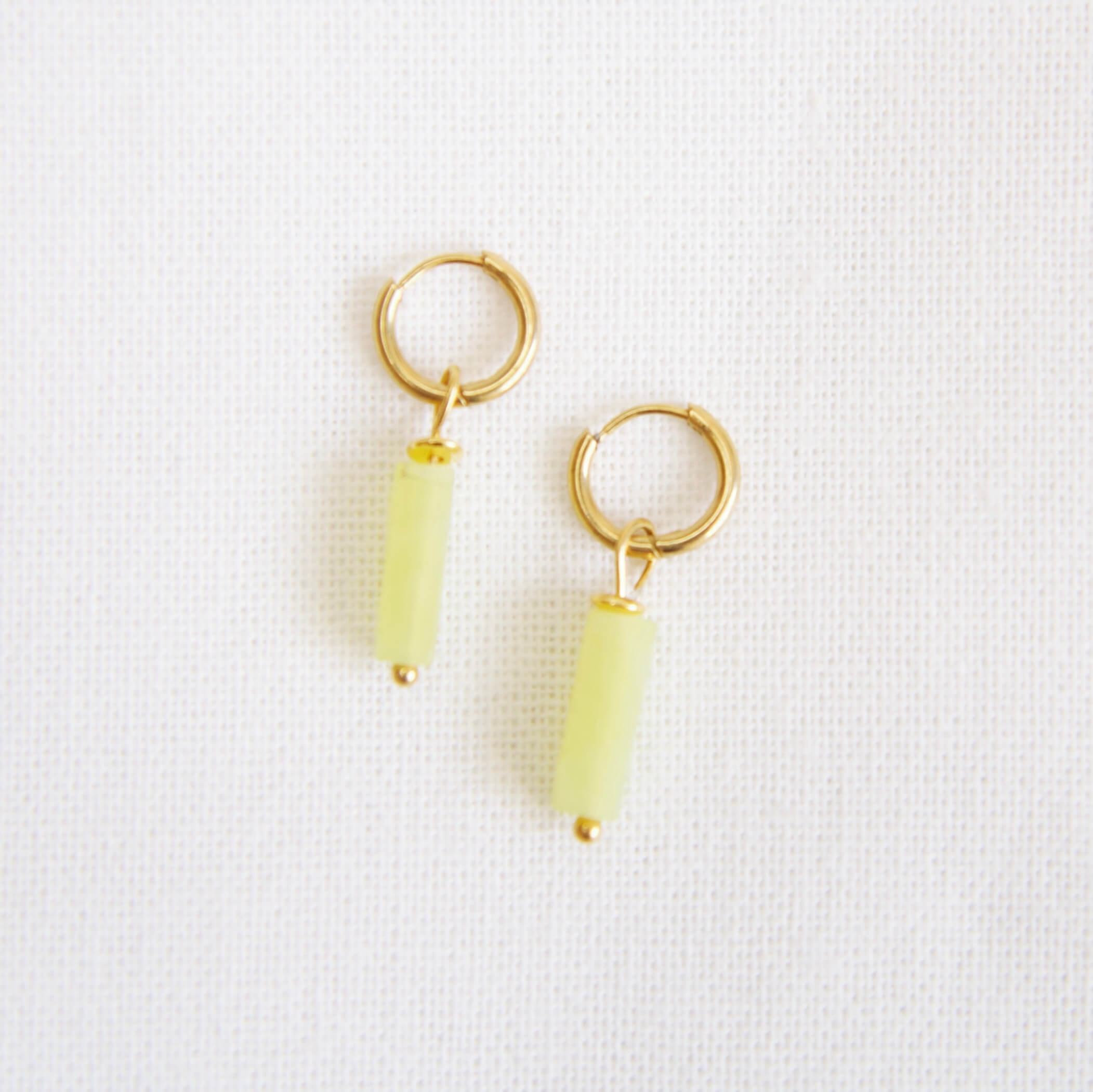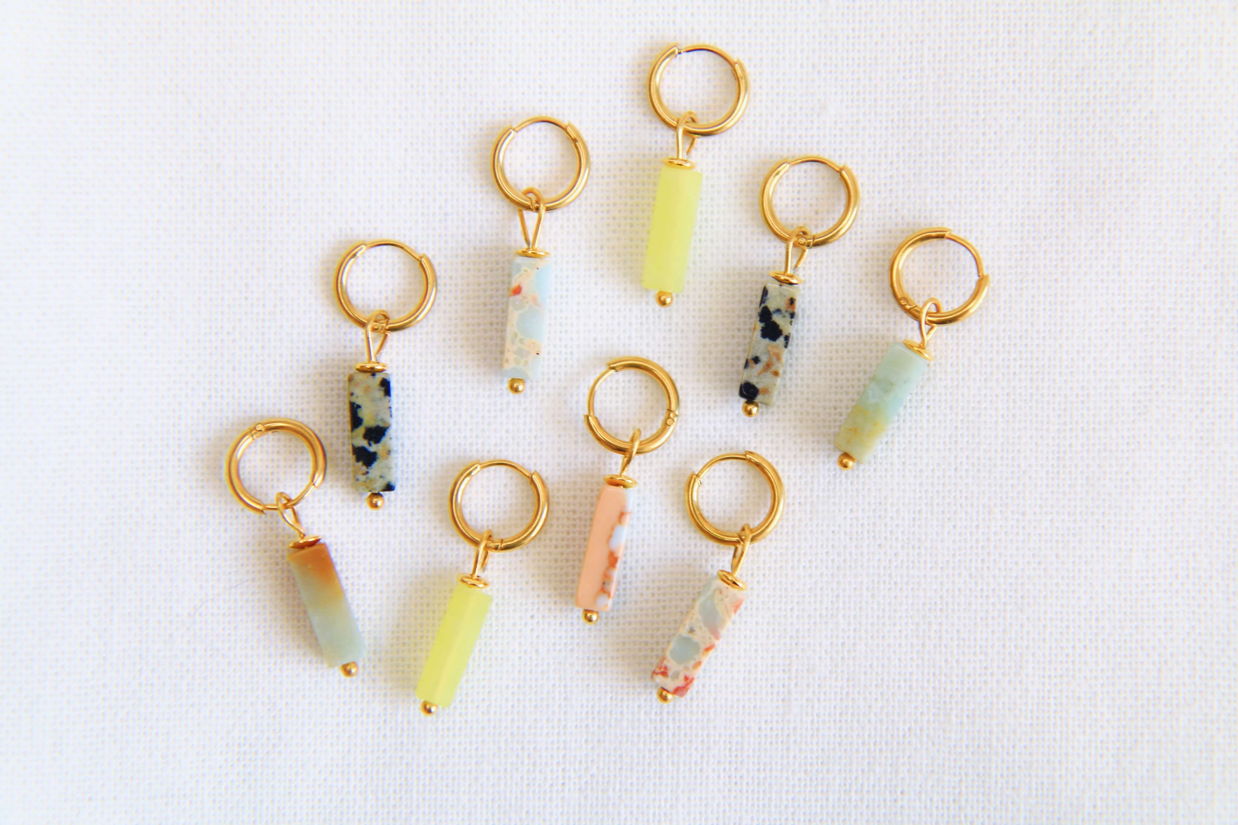 Deze unieke oorbellen zijn gemaakt van stainless steel ringen met daaraan een tube van echt van natuursteen, de Serpentijn! Bovenop de tube bevind zich nog een mooie platte kraal met gouden plating om de oorbel helemaal af te maken!